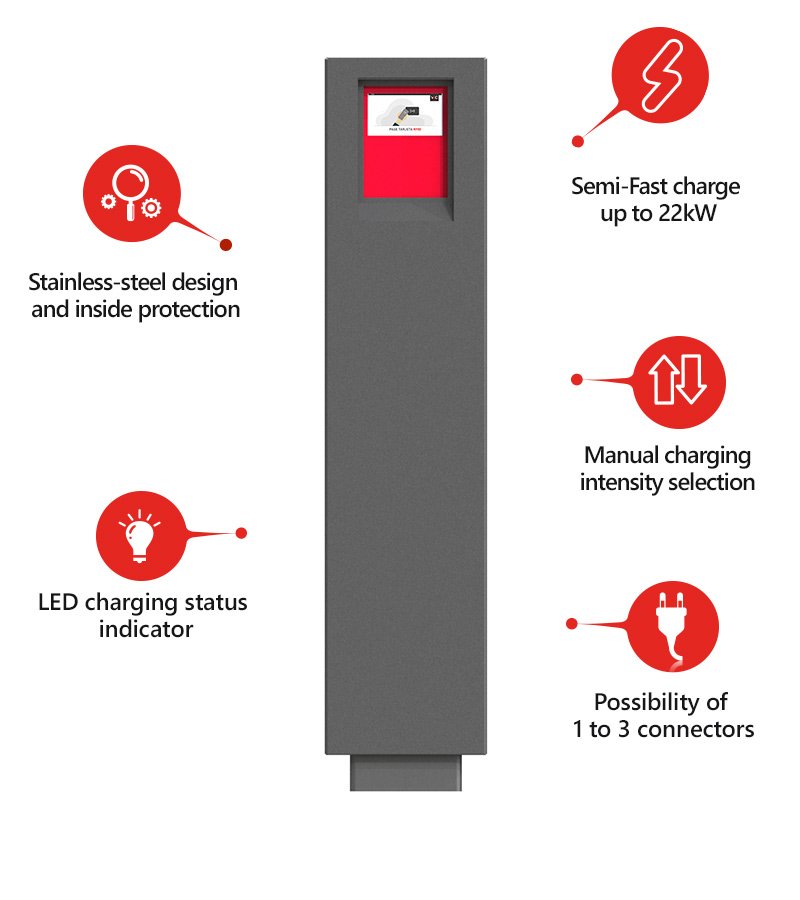 În varianta 22kW poate fi util pentru instalații publice unde oricine are acces la stație prin Aplicație mobilă sau chiar si la liber (gratuit), cât și pentru zone comerciale sau rezidențiale unde o incărcare mai lentă e la fel de utilă.